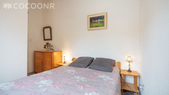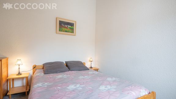 - Chambre parentale aménagée avec un lit double (140 cm x 190 cm), 2 tables de nuit, commode