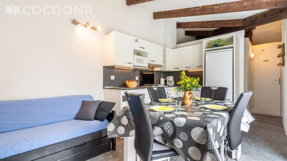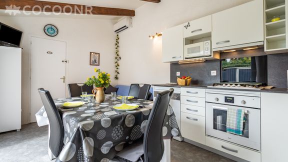 - Cuisine entièrement équipée ouverte sur le coin salle à manger avec : table à manger, 4 chaises, four, plaques de cuisson, réfrigérateur, cafetière à filtres, vaisselle et couverts...