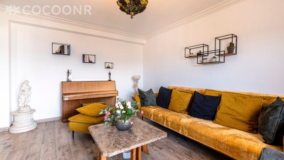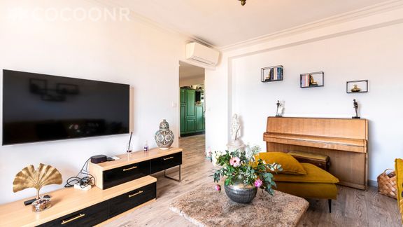 - Une pièce de vie de 25 m² avec TV, canapé et piano