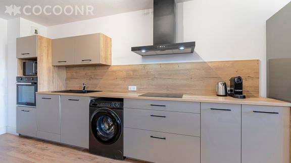 - Une cuisine équipée avec notamment : bouilloire électrique, four, four à micro-ondes, lave-vaisselle, plaques de cuisson...