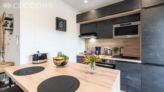 - Une pièce de vie de 31 m² avec TV, un coin nuit avec canapé-lit double et une cuisine ouverte équipée comprenant notamment : bouilloire électrique, four, four à micro-ondes, grille-pain, lave-vaisselle, plaques de cuisson...
