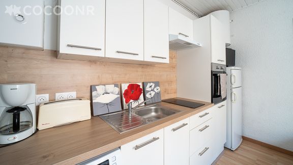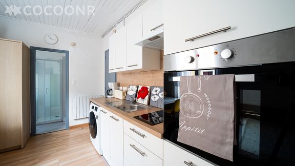 - Une cuisine équipée avec notamment : bouilloire électrique, four, four à micro-ondes, grille-pain, plaques de cuisson...