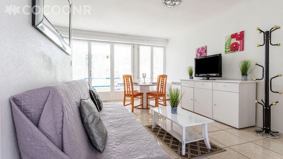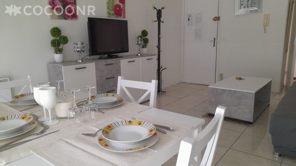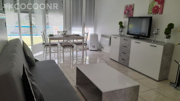 - Une pièce de vie de 30 m² avec TV, canapé et espace repas.