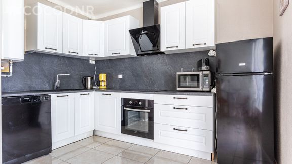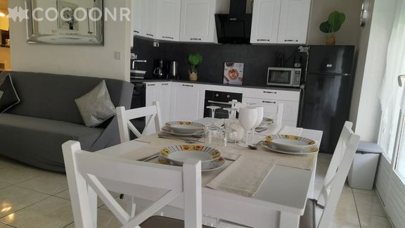 - Une cuisine ouverte équipée avec notamment : bouilloire électrique, four, four à micro-ondes, grille-pain, lave-vaisselle, plaques de cuisson, machine à café à filtre...