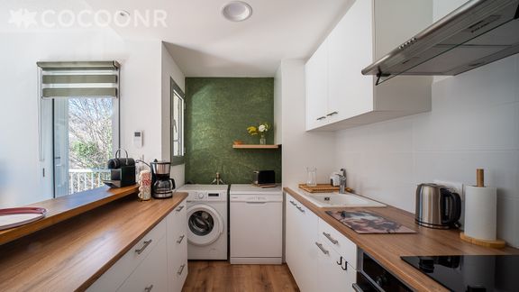 - Une cuisine ouverte, équipée avec notamment : bouilloire électrique, four, four à micro-ondes, grille-pain, lave-vaisselle, plaques de cuisson...