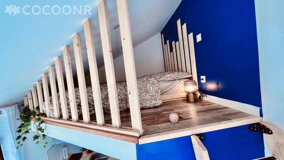 - Une mezzanine avec un lit double (140×190) (hauteur sous plafond basse).