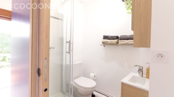 - Une pièce de vie avec TV (bouquet Orange et OCS), Wifi (fibre optique), lit double (140×190) et rangements.
