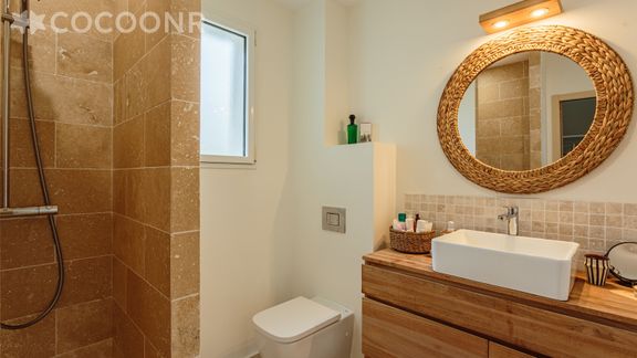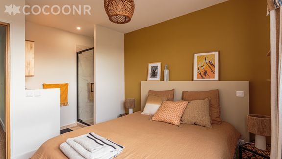 - Chambre 2 : un lit queen-size (160×200) avec une salle d'eau attenante (avec douche)