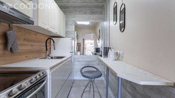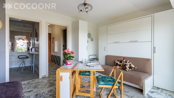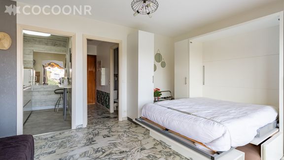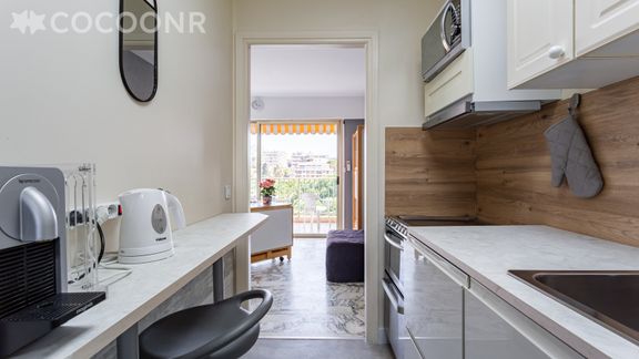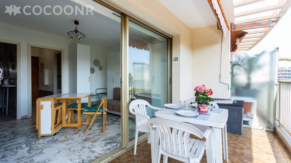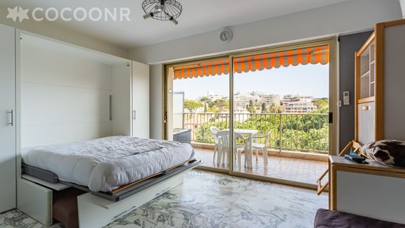 L'agence Cocoonr/Book&Pay vous offre à la location, sur Juan les Pins, commune d’Antibes, ce charmant studio climatisé, à moins d’un kilomètre de la plage, d’une superficie de 28 m² et pouvant accueillir jusqu'à 2 voyageurs. Situé au 4e étage (avec ascenseur), il se compose d’une jolie pièce à vivre, une cuisine équipée, une salle d'eau et d'une terrasse donnant sur le square Sidney Béchet Pinède sans vis à vis.