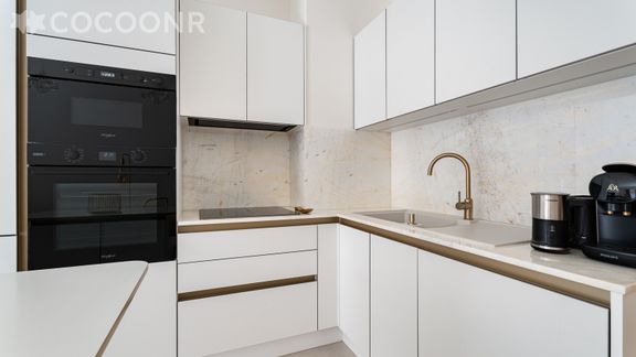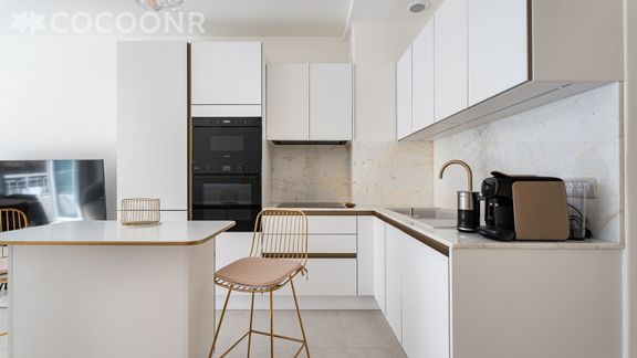 - Une cuisine ouverte équipée avec notamment : bouilloire électrique, four, four à micro-ondes, grille-pain, plaques de cuisson...