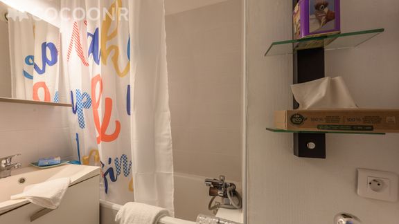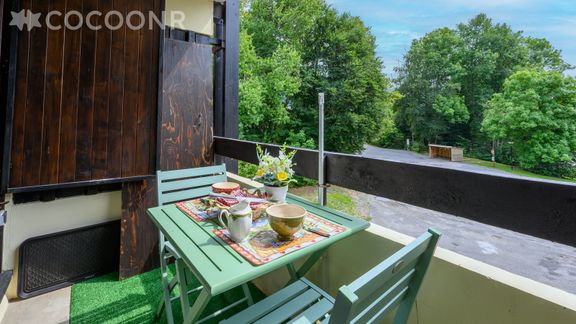 Situé au 1er étage sans ascenseur d'un bâtiment (Le Silène) de 3 étages, il dispose d'un salon avec télévision, canapé-lit double et coin repas, d'un espace nuit avec deux lits wagons superposés, d'une kitchenette, d'une salle de bain avec baignoire et de toilettes séparées, ainsi que d'un balcon de 4 m² pour profiter des beaux jours, été comme hiver.