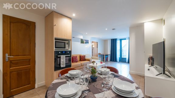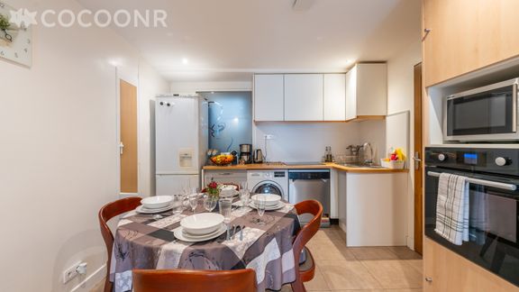 - Une cuisine équipée avec notamment : bouilloire électrique, four, four à micro-ondes, grille-pain, lave-vaisselle, plaques de cuisson...