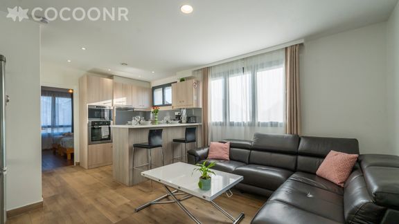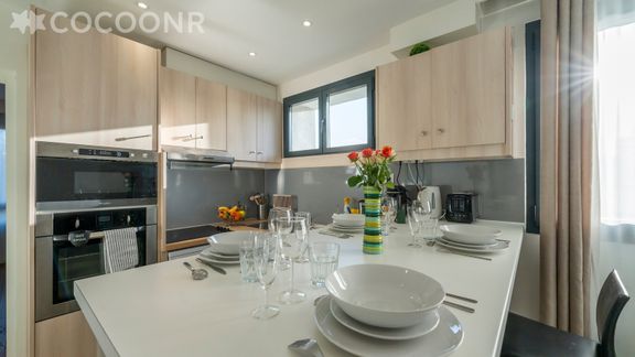 - Une cuisine équipée avec notamment : bouilloire électrique, four, four à micro-ondes, grille-pain, lave-vaisselle, plaques de cuisson...