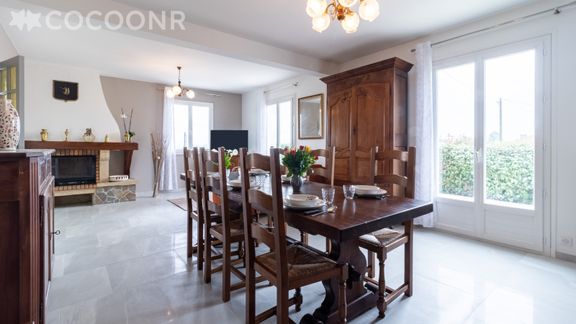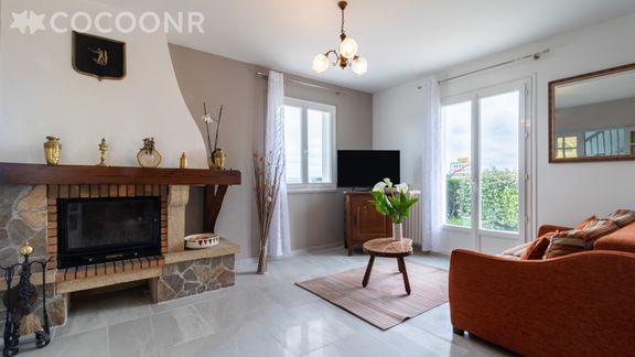 - Une pièce de vie de 50 m² avec TV, canapé, cheminée décorative et espace salle à manger.