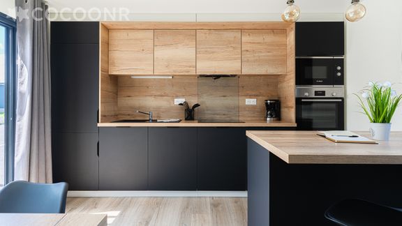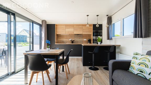 - Une cuisine ouverte équipée avec notamment : bouilloire électrique, four, four à micro-ondes, grille-pain, lave-vaisselle, plaques de cuisson...