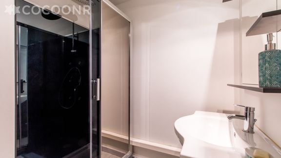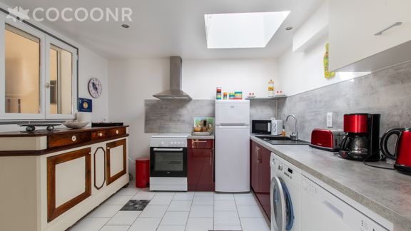 - Une cuisine équipée avec notamment : bouilloire électrique, four, four à micro-ondes, grille-pain, lave-vaisselle, plaques de cuisson...