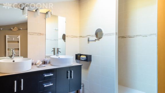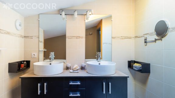 - Une cuisine équipée avec notamment : bouilloire électrique, four, four à micro-ondes, grille-pain, lave-vaisselle, plaques de cuisson, cafetière à dosettes Senseo... et espace repas.