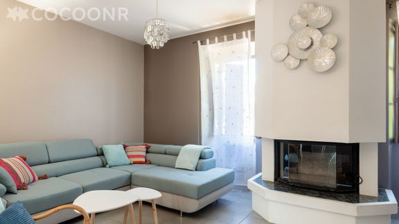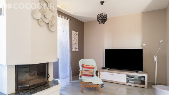 - Une pièce de vie de 80 m² avec TV, cheminée (décorative), canapé, fauteuil et espace salle à manger.