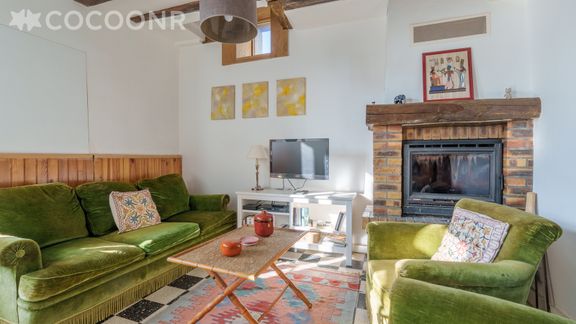 - Une pièce de vie de 25 m² avec canapé, fauteuils, TV, cheminée
