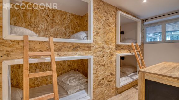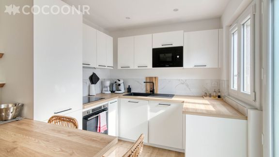 - Une cuisine équipée avec notamment : bouilloire électrique, four, four à micro-ondes, grille-pain, lave-vaisselle, plaques de cuisson...