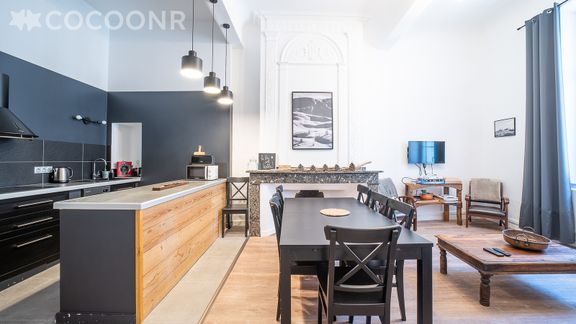 - Une cuisine équipée avec notamment : bouilloire électrique, four, four à micro-ondes, grille-pain, lave-vaisselle, plaques de cuisson...