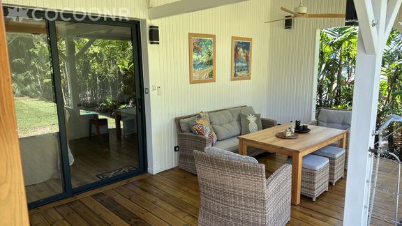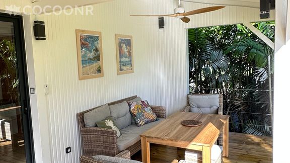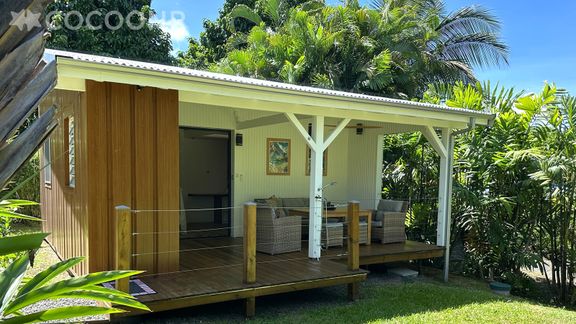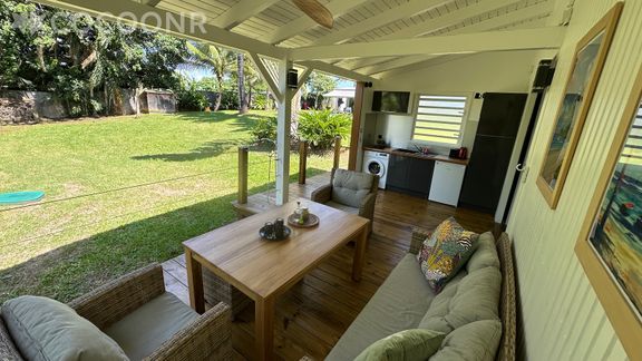 - Une varangue couverte / terrasse avec une table, un canapé, des fauteuils et une kitchenette équipée avec notamment : bouilloire électrique, four à micro-ondes, grille-pain, plaques de cuisson...