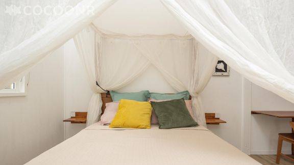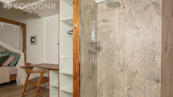 - Une chambre avec un lit à baldaquin queen-size (160×200) et salle d'eau ouverte avec douche, double vasque, WC