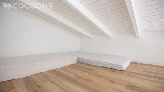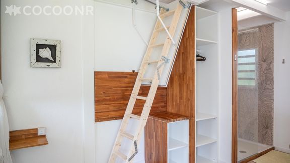 Une mezzanine avec deux matelas au sol (l’échelle d’accès est raide).