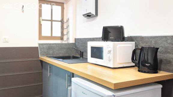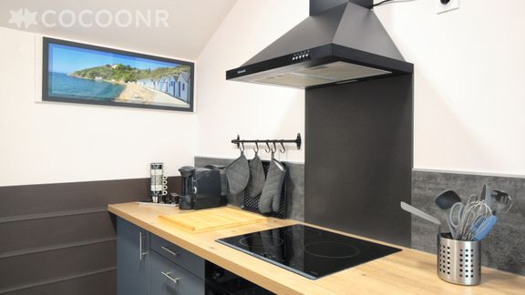 - Une cuisine équipée séparée avec notamment : bouilloire électrique, four, four à micro-ondes, plaques de cuisson...