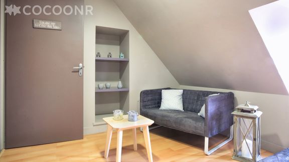 - Chambre 2 : avec 1 lit queen-size (160×200), canapé, étagères et lavabo