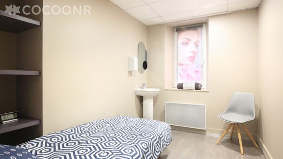 - Chambre 1 : avec un lit simple (90×190), étagères et lavabo