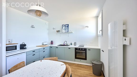 - Une cuisine ouverte équipée avec notamment : bouilloire électrique, four, four à micro-ondes, grille-pain, lave-vaisselle, plaques de cuisson...