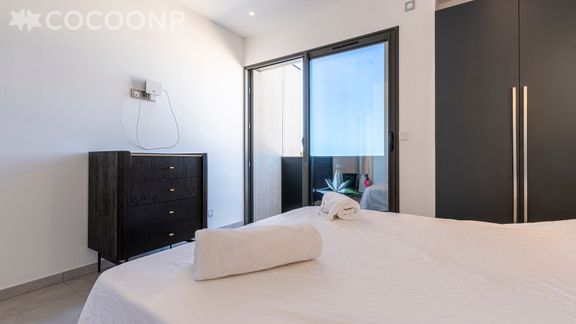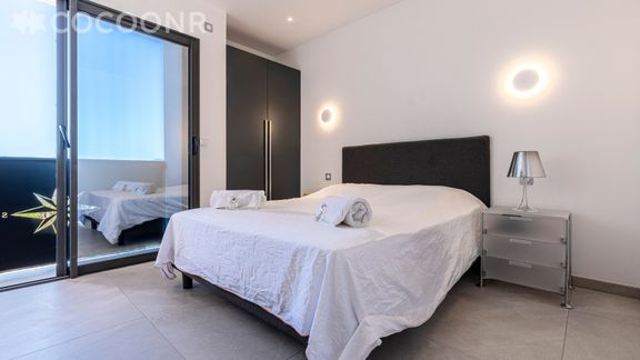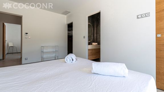 - Chambre 4 : chambre parentale avec un lit queen-size (160×200), sa salle d'eau attenante (avec douche et WC) et un aperçu mer