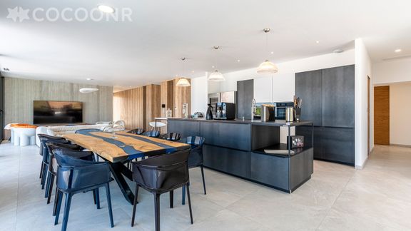 - Une cuisine équipée avec notamment : deux frigos et congélateurs avec compartiment vin, bouilloire électrique, four, four à micro-ondes, grille-pain, lave-vaisselle, plaques de cuisson