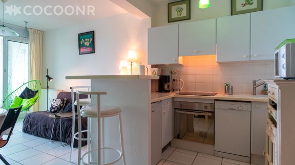 - Une pièce de vie de 37 m² avec TV, canapé-lit double, cuisine équipée avec notamment : bouilloire électrique, four, four à micro-ondes, grille-pain, lave-vaisselle, plaques de cuisson...