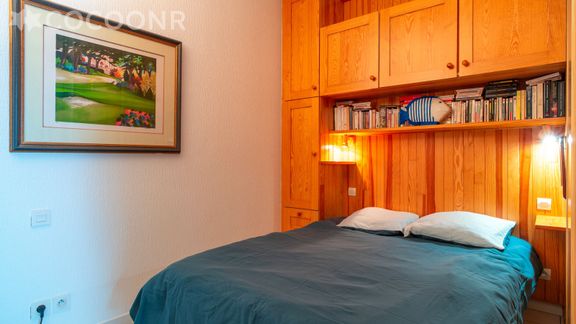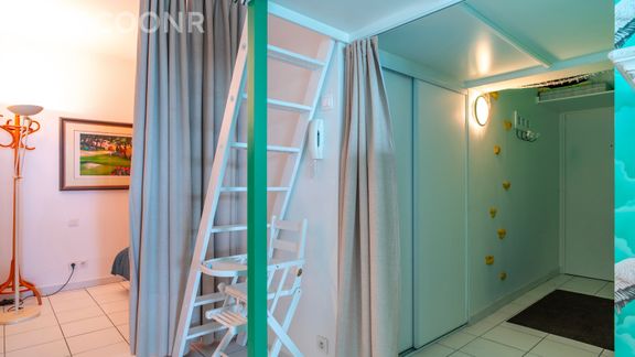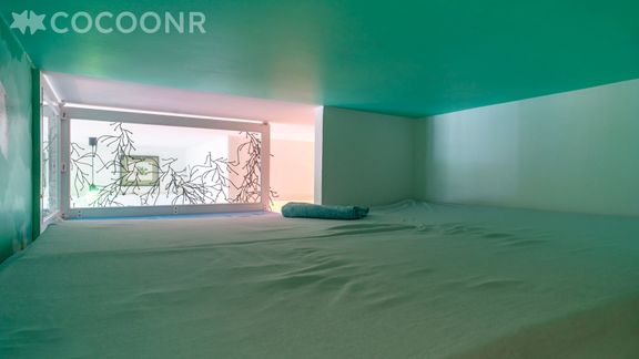 - Un espace nuit avec un lit double (140×190), séparé de la pièce de vie par un rideau