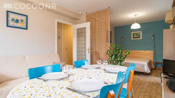 - Une pièce de vie de 21 m² avec TV, canapé, espace repas, un premier coin nuit de 8 m² séparé par une cloison fixe en bois avec un lit double (140×200). Un second coin nuit séparé par un meuble haut avec deux lits simples (90×200), pouvant être jumelés.