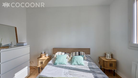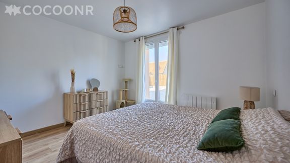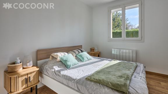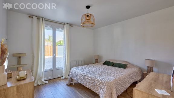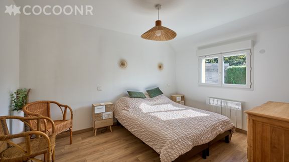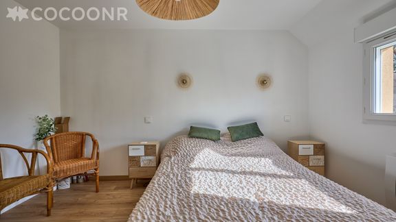 - Chambre 2 : lit double 140 x 190 cm. Armoire. Accès direct au jardin par une baie vitrée.