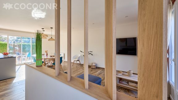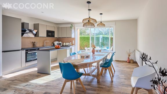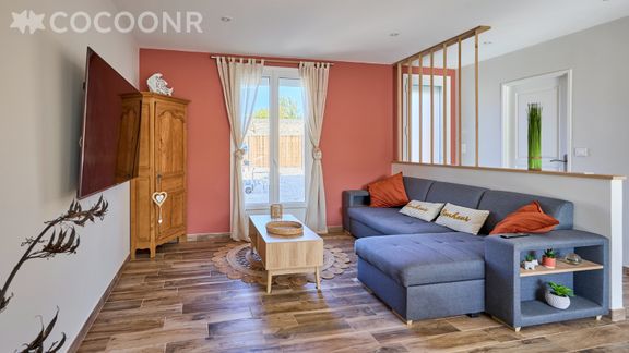 - Salon-séjour aménagé avec un canapé convertible en lit double, TV, grande table conviviale pour 6 personnes, cheminée décorative. Accès au jardin par une baie vitrée.
