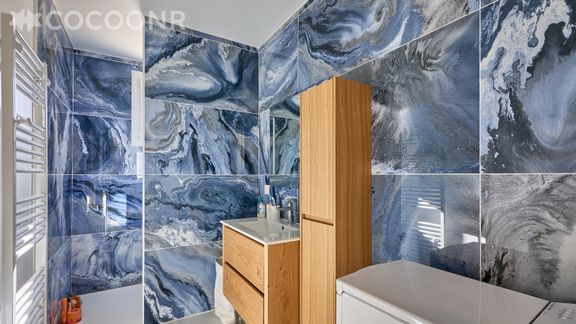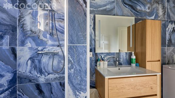 - Salle d'eau avec douche, lavabo, machine à laver.