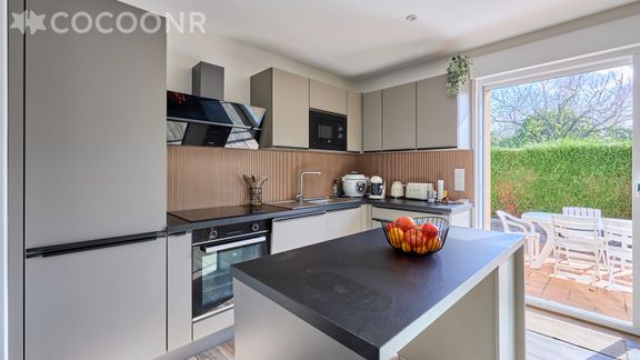 - Cuisine séparée toute équipée, avec accès direct à la terrasse et au jardin par une grande baie vitrée : frigidaire, plaques au gaz, four, micro-ondes, cafetière, lave-vaisselle, bouilloire... Table à manger pour 4 personnes.