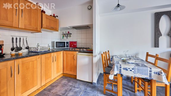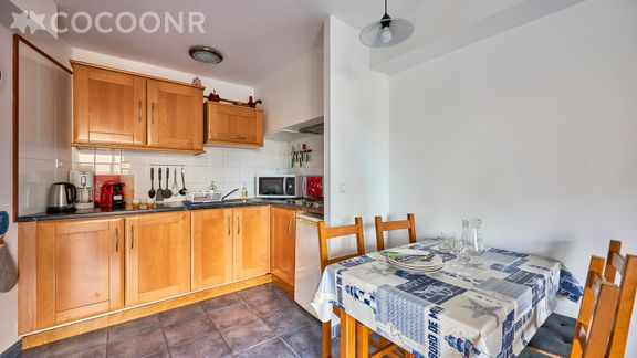 - Une cuisine ouverte et équipée avec notamment : bouilloire électrique, four à micro-ondes, grille-pain, plaques de cuisson...