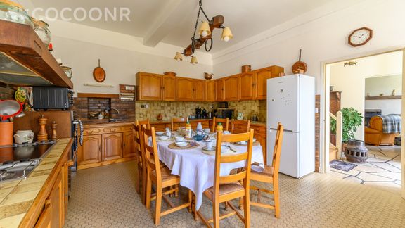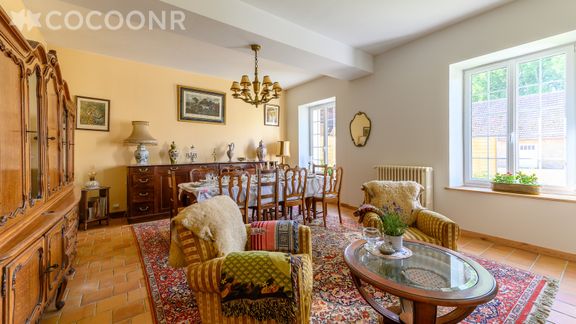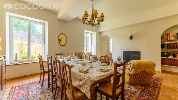 - Une pièce de vie de 50 m² avec TV, fauteuils, espace repas et cheminée