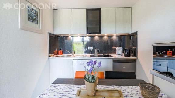 - Une cuisine équipée avec notamment : bouilloire électrique, four, four à micro-ondes, grille-pain, lave-vaisselle, plaques de cuisson, cafetière à dosettes Tassimo...