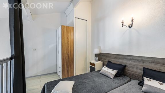 - Une chambre en mezzanine (escalier en bois) avec un lit king-size (180×200)