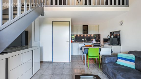 - Une pièce de vie de 30 m² avec TV coin salon avec un canapé-lit double et un coin repas.