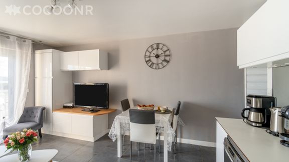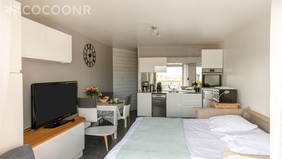 - Une pièce de vie de 21 m² avec TV, canapé-lit double et coin repas
