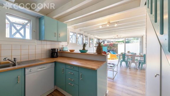 - Une cuisine ouverte équipée avec notamment bouilloire électrique, four, four à micro-ondes, grille-pain, lave-vaisselle, plaques de cuisson...