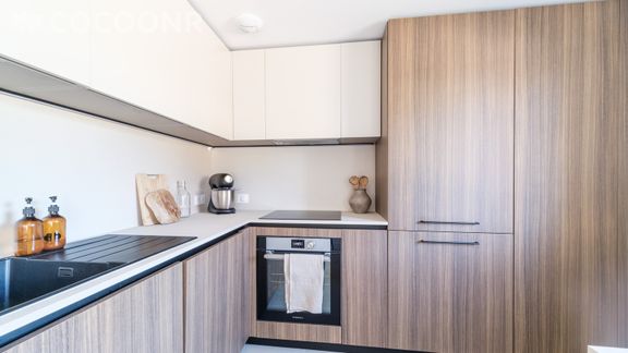 - Une cuisine ouverte, équipée avec notamment : bouilloire électrique, four, four à micro-ondes, grille-pain, lave-vaisselle, plaques de cuisson...