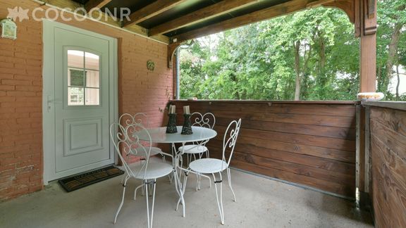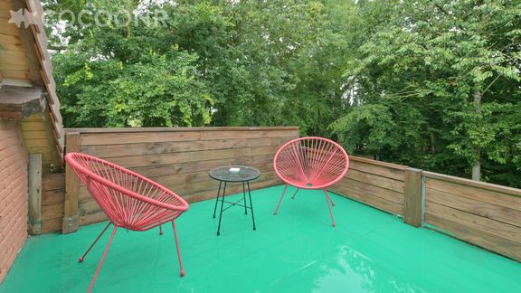 - Une terrasse couverte de 8 m² avec mobilier comprenant un escalier de meunier pour monter à l'étage supérieur qui donne accès à la chambre et à une seconde terrasse